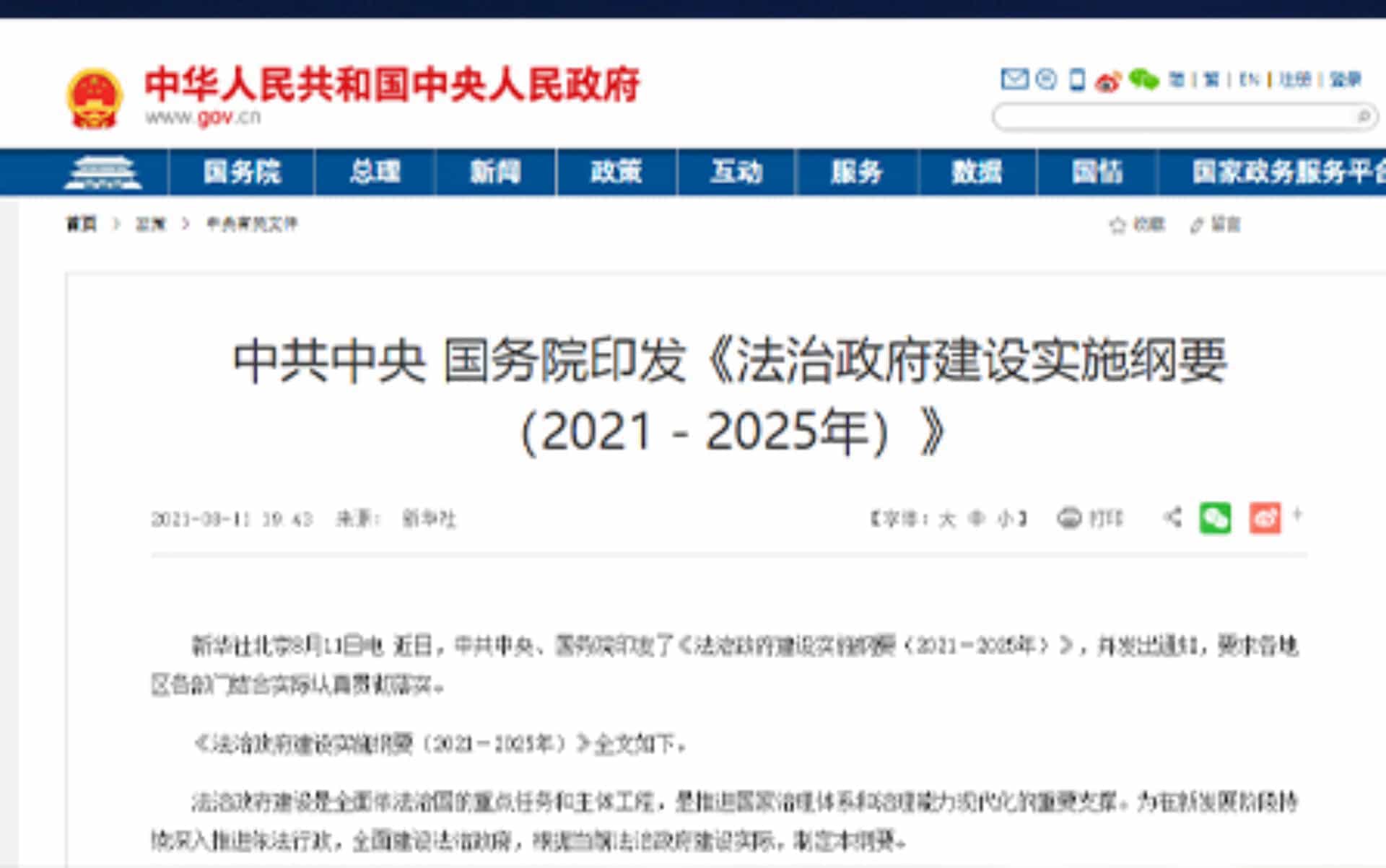 近日,中共中央、國務院印發了《法治政府建設實施綱要(2021-2025年)》,并發出通知,要求各地區各部門結合實際認真貫...