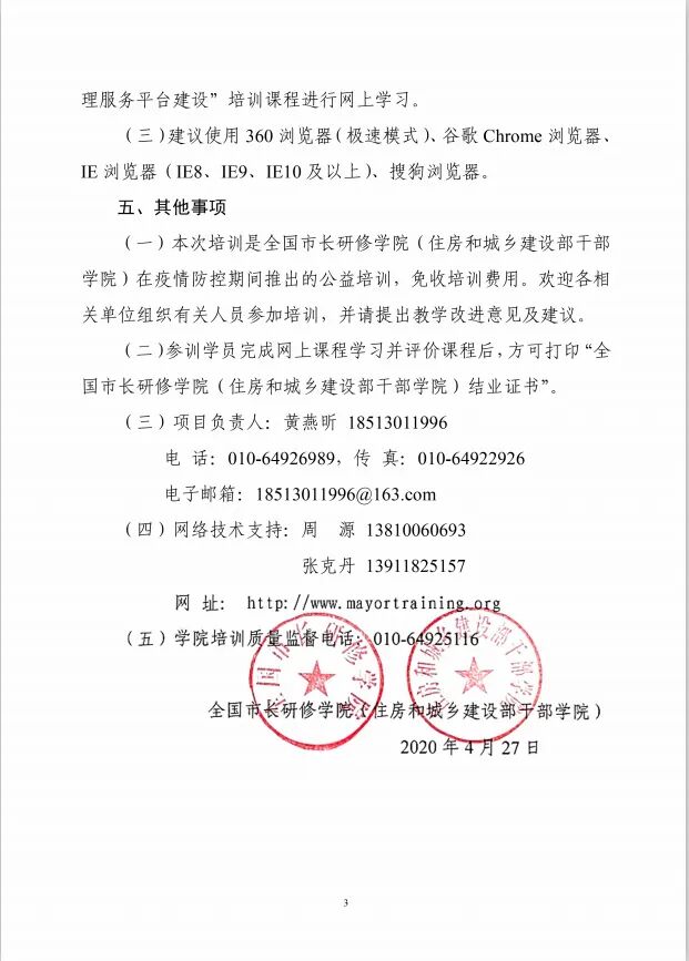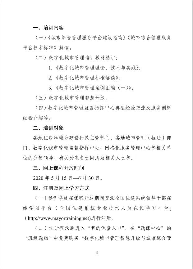 根據《住房和城鄉建設部辦公廳關于印發2020年部機關及直屬單位培訓計劃的通知》(建辦人〔2020〕4號)安排,全國市長研修學院(住房和城鄉建設部干部學院)決定在疫情防控期間舉辦“數字化城市管理智慧升級與城市綜合管理服務平臺建設網上公益培訓”。