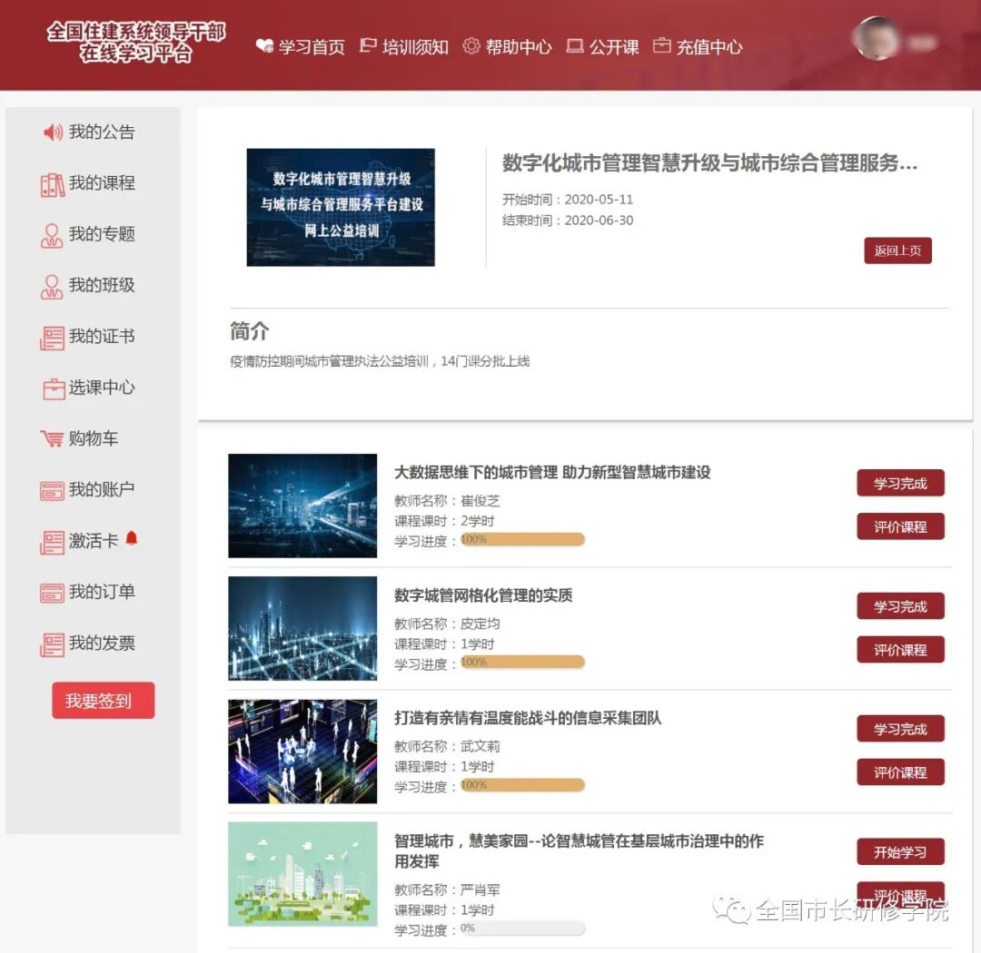 3. 注冊登錄后進入“我的課堂入口”,在“選課中心”的“班級選購”中免費購買“數字化城市管理智慧升級與城市綜合管理服務平臺建設”培訓課程進行網上學習。
